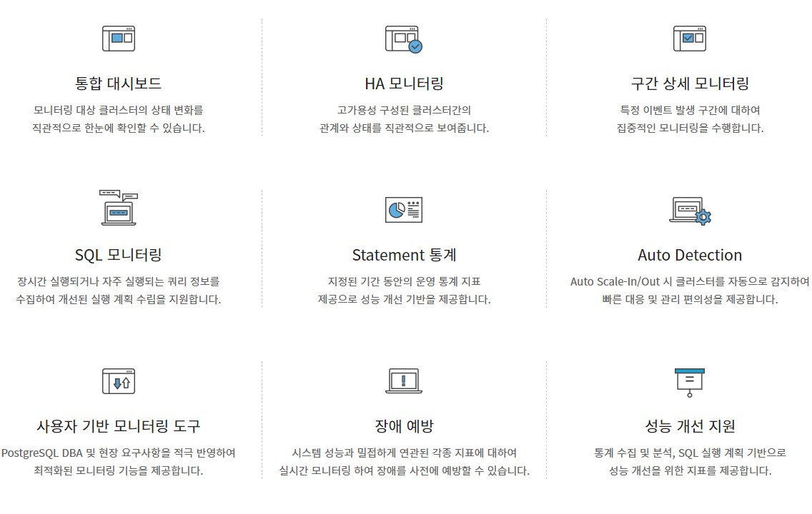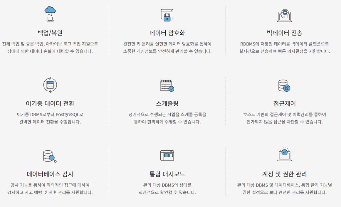 eXperDB는 PostgreSQL을 이용한 DBMS로 PostgreSQL의 장점을 가지고 있습니다.