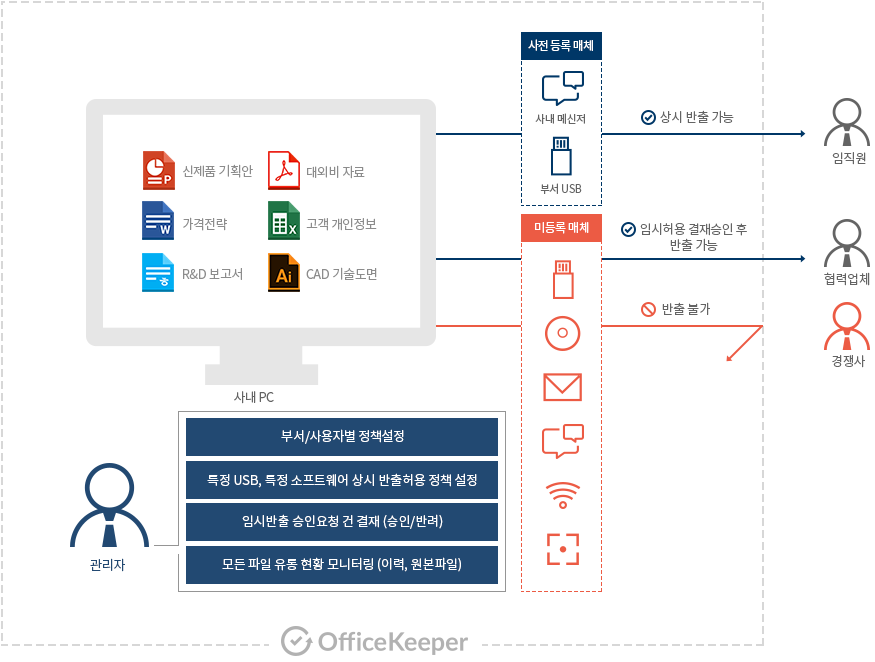 -정책에 따라 비인가된 출력, (부서, 사용자, 개인정보 포함 여부) 제어