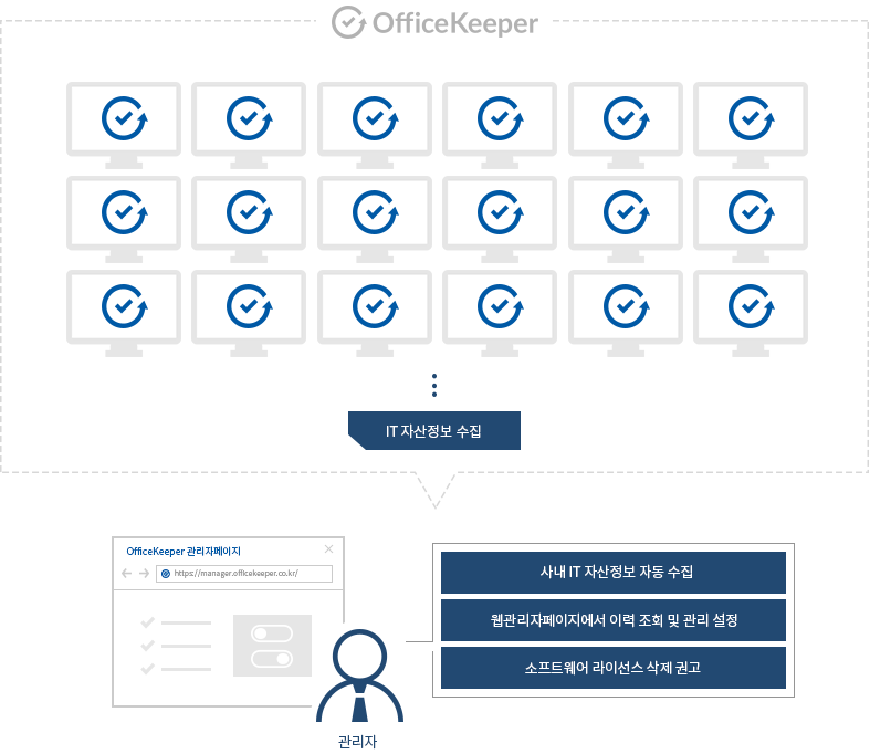 번거로운 H/W, S/W 수량관리는 물론, 노트북 반출현황 관리와 컴퓨터 절전 중앙관리까지 다양한 관리 기능을 활용해 관리자의 업무 효율성을 높일 수 있습니다.