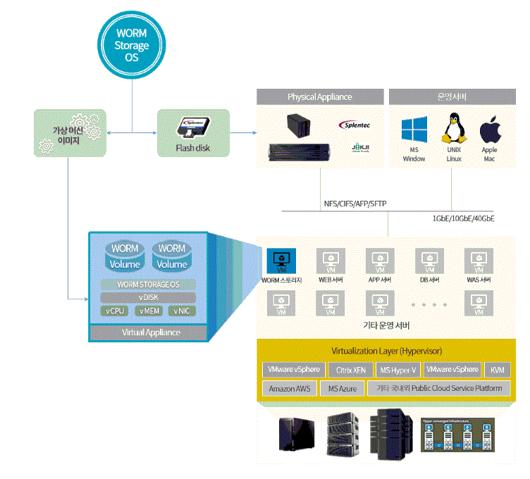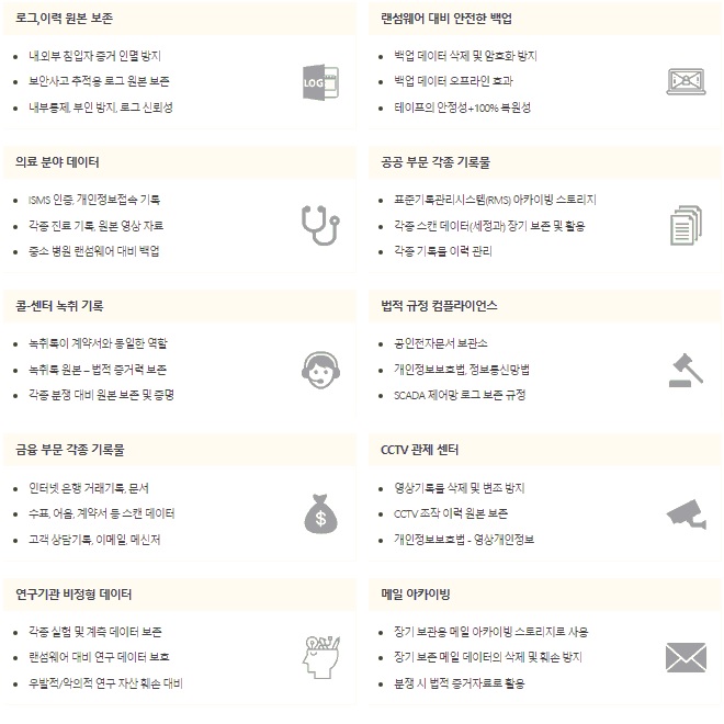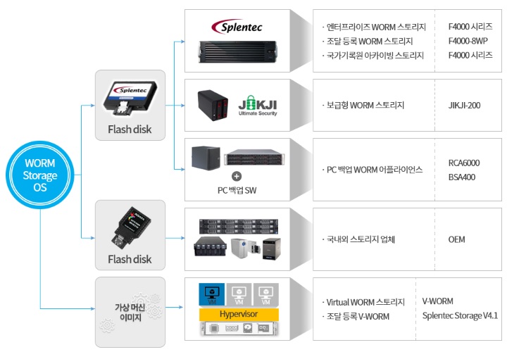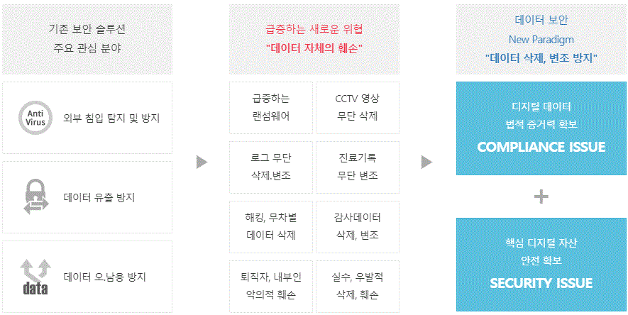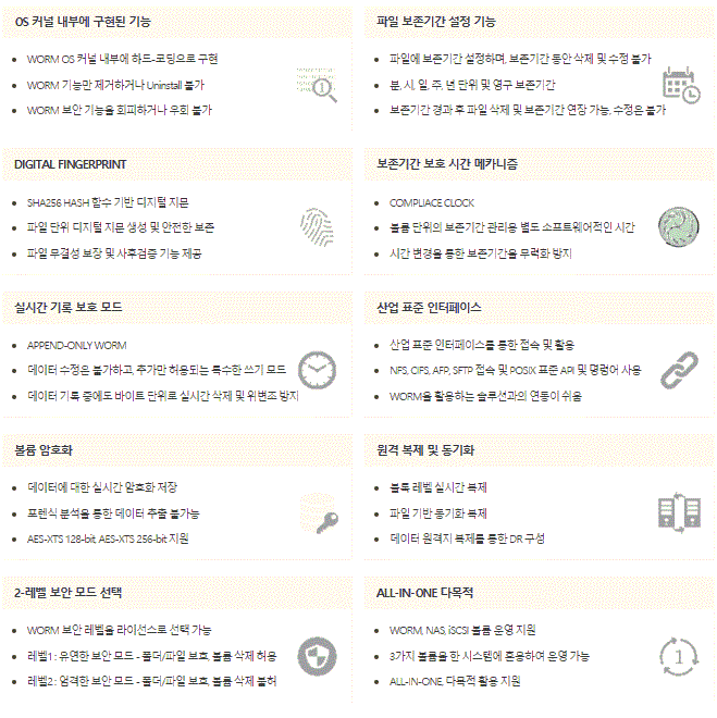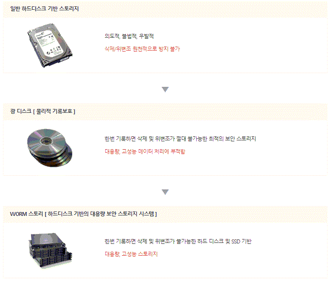 현존하는 다양한 보안 솔루션들은 주로 외부 침입 탐지 및 방지, 주요 데이터의 외부 유출 방지, 데이터 오남용 방지 등의 목적으로 합니다. 하지만 법적인 증거를 위해 원본이 보존되어야 하는 계약서, 진료기록 등의 컴플라이언스 데이터나 설계데이터, 소스코드, 각종 문서 등 조직의 핵심 디지털 자산에 대한 무단 삭제, 우발적 삭제 및 의도적 변조 행위 등을 막을 수 있는 보안 솔루션은 없습니다. WORM(Write-Once Read-Many) 스토리지는 광-디스크 처럼 한 번 기록하면 미디어를 파기하지 않는 이상 데이터를 훼손할 수 없는 특성을 가진 스토리지를 일컫는 용어입니다. 올리브텍은 한 번 기록된 데이터에 대해서는 파일단위로 지정되는 보존 기간 동안에는 어떠한 권한으로도 파일을 삭제하거나 변조할 수 없도록 하는 기능을 제공하는 WORM 스토리지 OS 원천 기술을 개발하였으며, 이 보안 WORM 스토리지 OS를 탑재한 하드디스크 및 SSD 기반의 대용량 고성능 WORM 스토리지 플랫폼, 보급형 WORM 스토리지 플랫폼, 가상 WORM 스토리지 어플라이언스 및 WORM 융합 솔루션을 제공합니다.